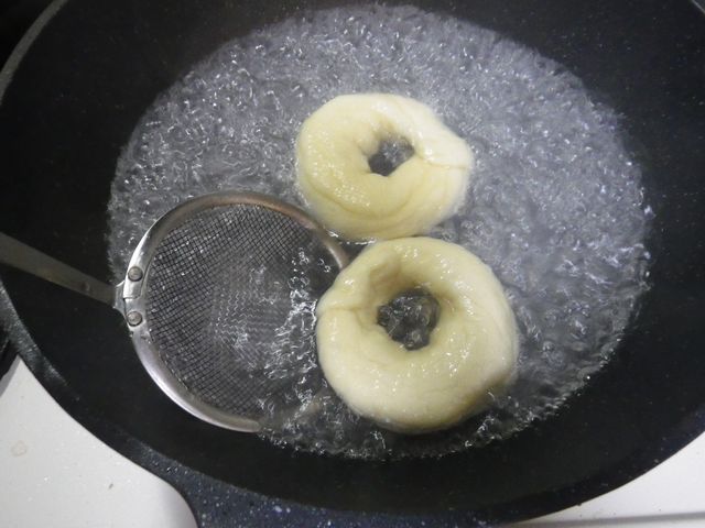 湯を沸かしてベーグル生地をゆでる。両面15秒ずつゆでる。