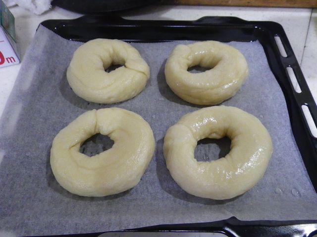 天板にクッキングシートをしき、ベーグル生地を並べる。