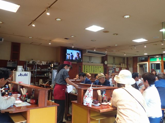 けっこうチェーン店的な店がまえだが、店内はいたって庶民的。カウンターの数が多いことが、一人でふらっと来る人が多いことも予感させる。