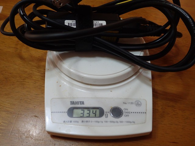 HP EliteBook FolioのACアダプターの重量を測ってみると・・・334gもあった。