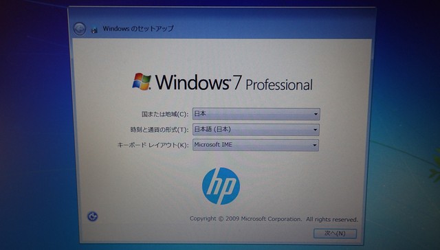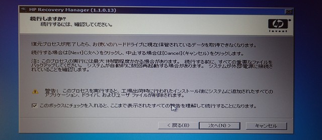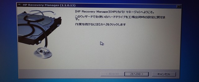 HP Recoveryが立ち上がる。作業を続けるので「次へ」をクリック。