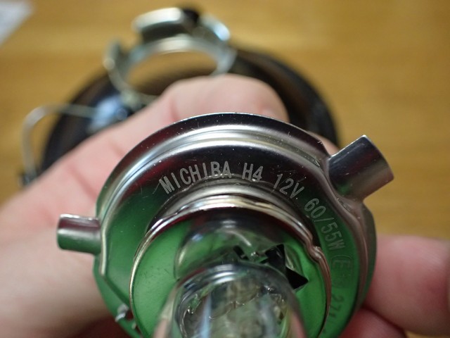 MICHIBA製のH4ハロゲンバルブ。60/55Wとなっている。これが始動時は55W→20Wになるので、ちょっとはバッテリーの負担が減るだろう。