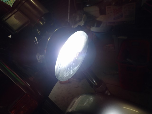 ハロゲンに比べ、真っ白な光だ。ところで、このLEDライトは本体先端に冷却ファンがあるため、少々全長が長め。なので、CB223Sのヘッドライトユニットだと、マヂでギリギリ。