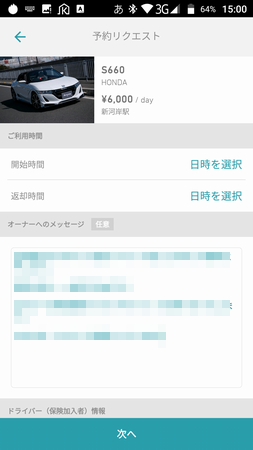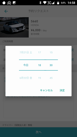 予約リクエストを送る。ただいま15時。17時に車をレンタルできるかも同時に確認してみる。