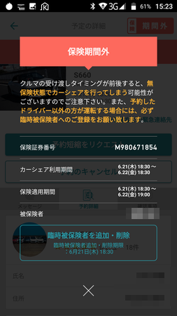 このようにエニカのレンタカー貸出期限がスタートすると「保険適用中」となる。