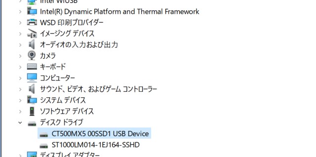 「ディスクドライブ」をクリックするとUSBに接続をしたSSDドライブが認識されている。