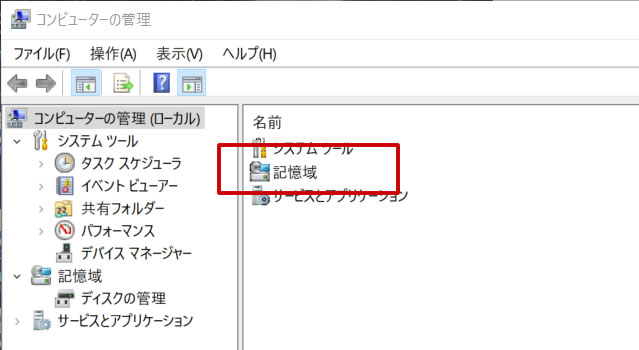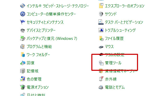 「Winキー」+「X」→「コントロールパネル」→「管理ツール」クリック→「コンピューターの管理」をクリックする