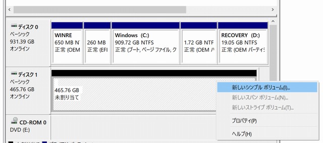 未割り当てとなっているドライブを右クリック→新しいシンプルボリュームをクリックする。