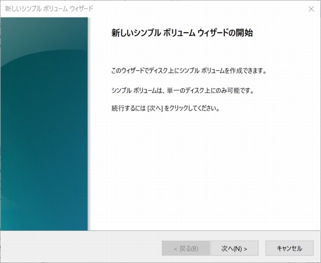 新しいシンプルボリュームウィザードの開始。次へをクリック。