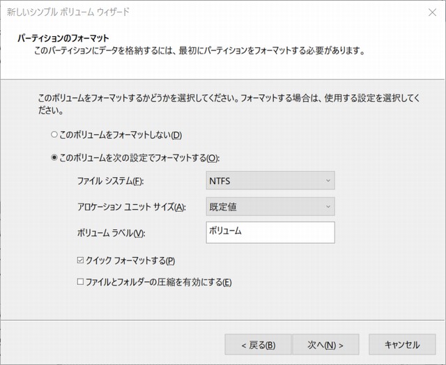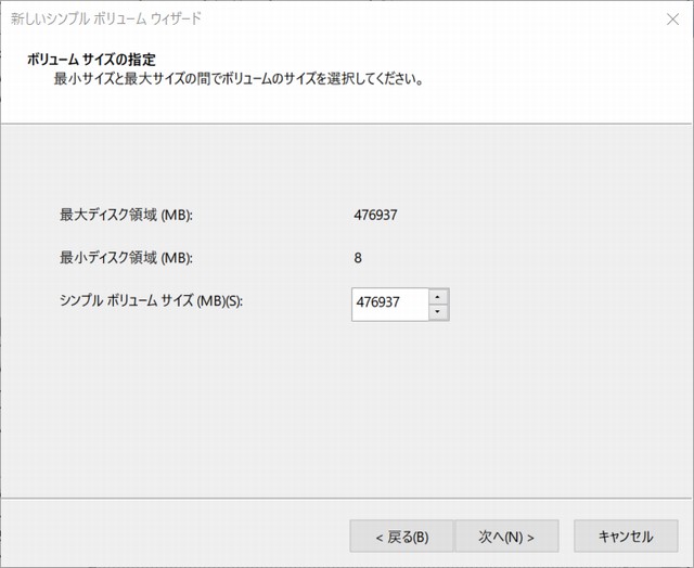 ボリュームサイズを決める。最大サイズが入力されているので、そのままでOK。次へ。