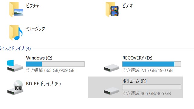 PCを開くと、先程フォーマットをしたSSDがボリュームFとして、認識をされている。