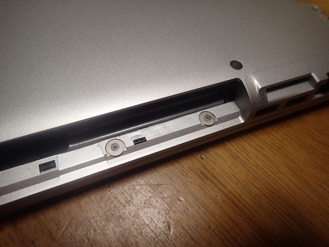 DVDドライブを外すと、その下にも隠しボルトがあるので、それも外す。