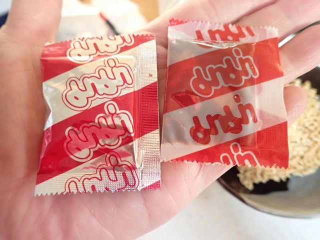 スープは2種類入っていて、左の顆粒スープは通常のラーメンスープで、右の液状のやつは辛いヤツ。お好みで入れる辛味ね。