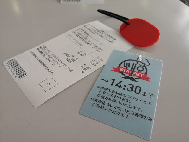 キャッシャーでバイキング料金を支払うとこのよにタイムカードとバイキングのタグを渡される。食べ物を取りに行くときは、このタグを腕などに付けていくようにする。