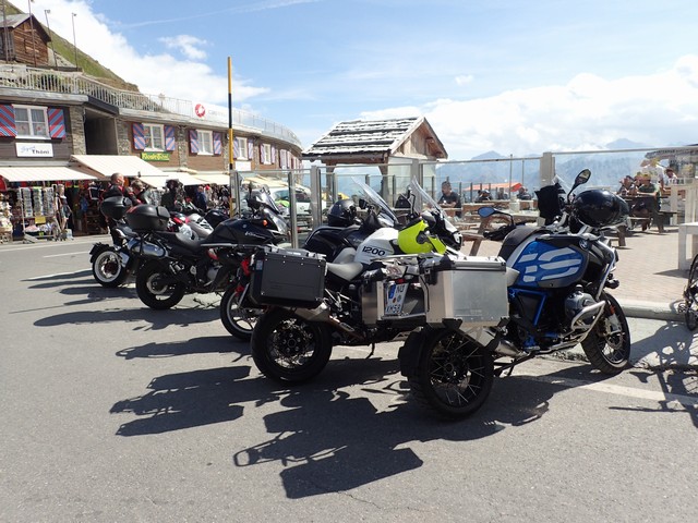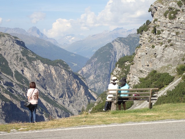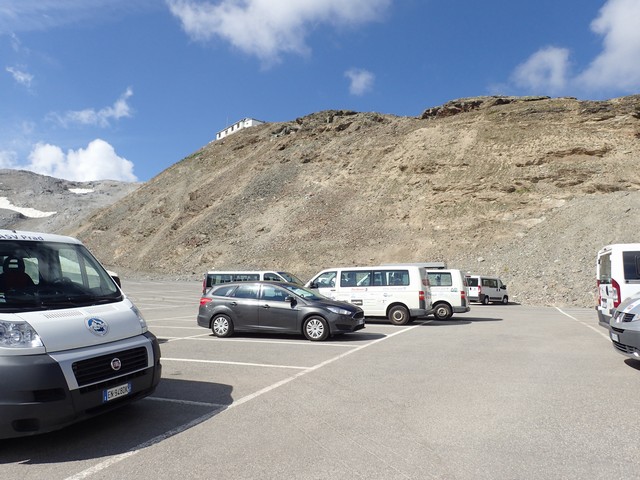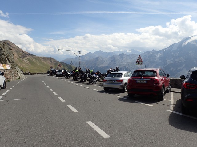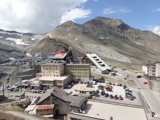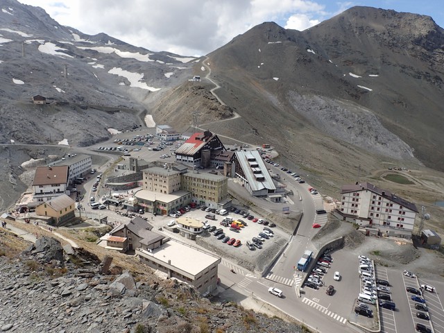 かなり登った。これがステルヴィオ峠の全景。ウチラが止めた駐車場は左上の駐車場ね。