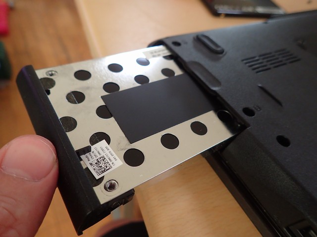 このようなスライド式のHDDケースでハードドライブを取り付けるタイプの場合、HDDケースに新しいSSDを入れてPCに戻すと思う。
