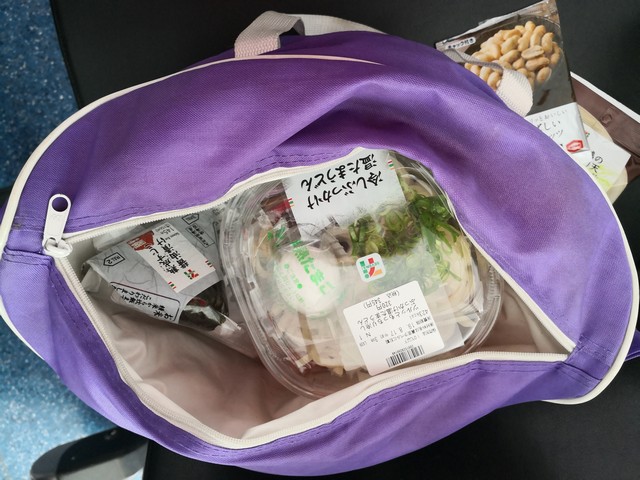 なので、このソフトクーラーバッグにコンビニでおにぎりや酒のアテなどを満載して、凍らせたペットボトルを入れて預け荷物で流す。