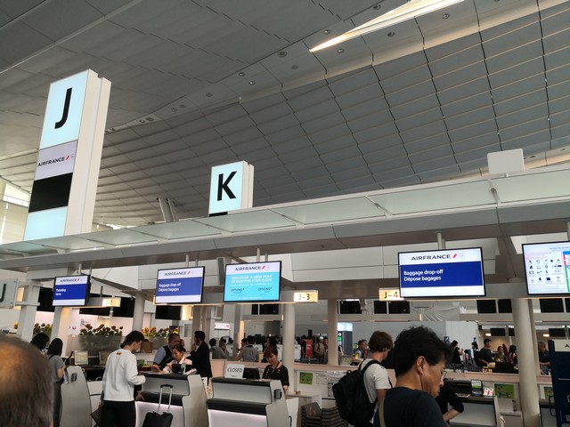 エールフランスAF279パリ行、2時間半前にチェックインカウンターに並ぶ。
