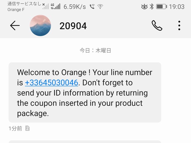 シートベルト着用サインが消え、通信機器使用が可能になったところで、スマホにオレンジSIMを挿す。すぐに電波を掴みSMSが飛んでくる。で、あっさりとつながった。コレは助かる。