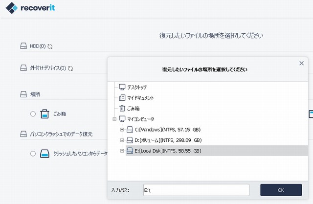 復元をする際にドライブの指定をしてくる。同じドライブは指定できないようなので、PC内や外付けドライブに復元をコピーするだけの容量を確保する必要があること念頭に置こう。
