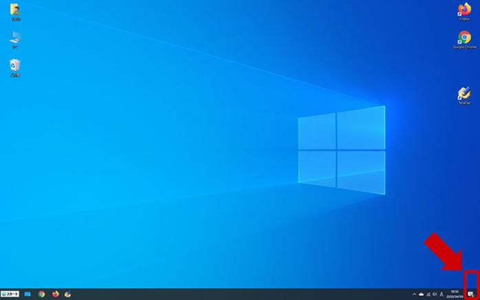 Windows10にはタスクバーの右端をクリックするとデスクトップを表示できる「デスクトップ表示」ボタンがあります。そう、タスクバー右端をクリックするんです。