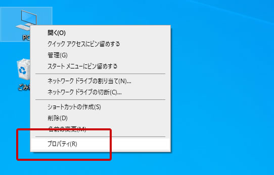 PC(コンピューター)を右クリック→プロパティをクリックする。
