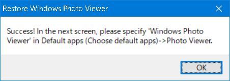 上記画面が表示されますので「Restore Windows Photo Viewer」をクリックします。「Success! the next screen, please Specify 'Windows Photo Viewer' in Default apps」というメッセージが表示されたら設定は完了です。