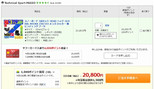 そこで、Yahooショッピングをチェックした所、めっちゃ格安スノボセットが3点(ボード・ブーツ・金具)で約2万円という格安さ。