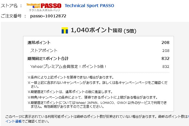注文確定後、1,040ポイント(5倍)を獲得した。