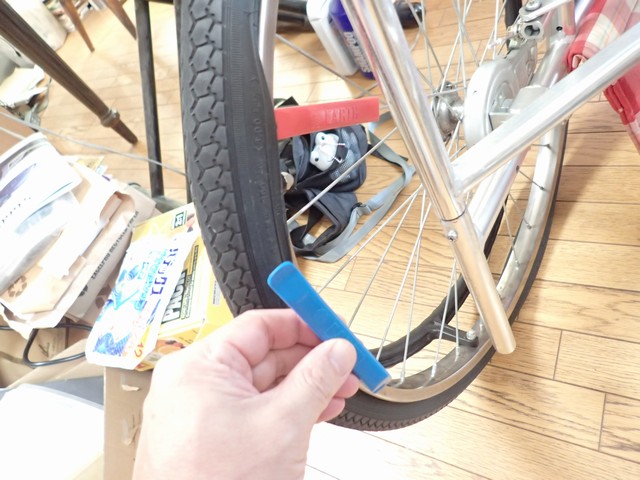 タイヤレバーはできるだけ最後に1回だけ使うようにするとよい。全周タイヤレバーを使って入れると、タイヤとリムにチューブを噛み込んでチューブが傷つき、またパンクをしてしまう。