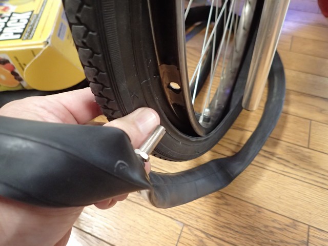 修理を完了したチューブは一旦ホイール内側に戻す。その後バルブの部分をホイールに挿入してから、チューブをもとに戻す。