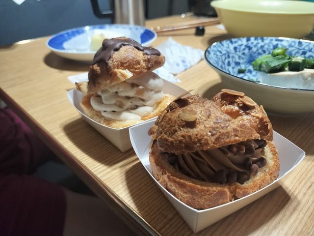 手前がプラリネシュー、奥がアップルパイシューです。プラネリはスライスアーモンドのシューにプラリネクリームにヘーゼルナッツチョコチップがかかっています。