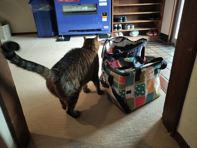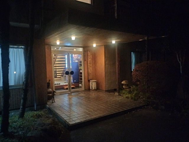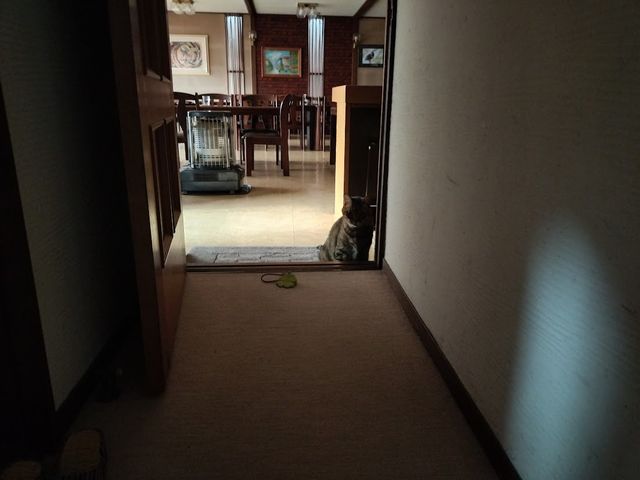 玄関前に来て女将さんに鍵を返す。食堂の方を見るとなにやら影が・・・