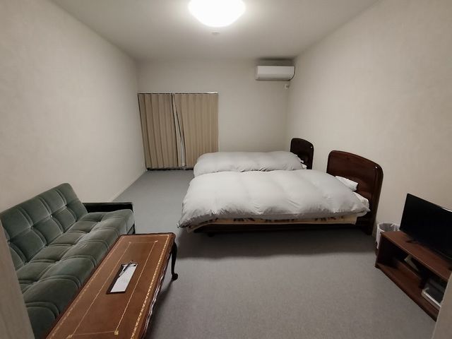 洋室ツインです。ホテル施設外観はちょっと昭和な感じですが、お部屋はとてもきれいでベッドも良い感じ。ソファー付きだしテレビもエアコンもかなり新し目でした。