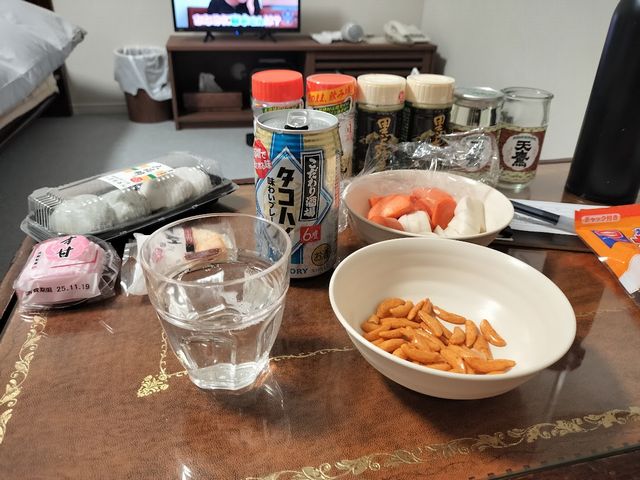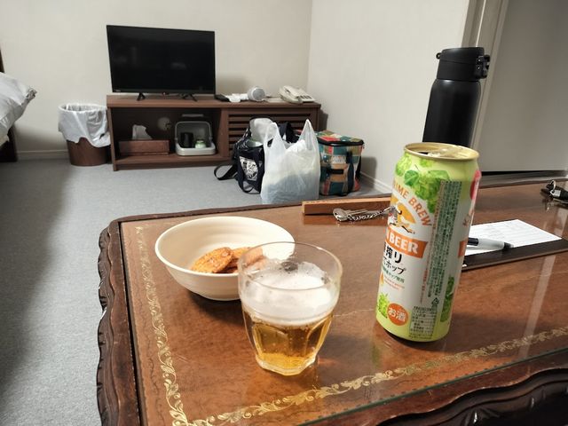 部屋に戻り柿の種と持参したお新香、和菓子スイーツなどをアテに酒はチューハイ、日本酒、焼酎など各種取り揃えている。オレのビート旅はいつものようにクーラーバッグと食器やコップなどを持参しているのだ。